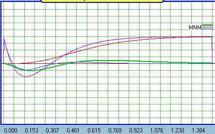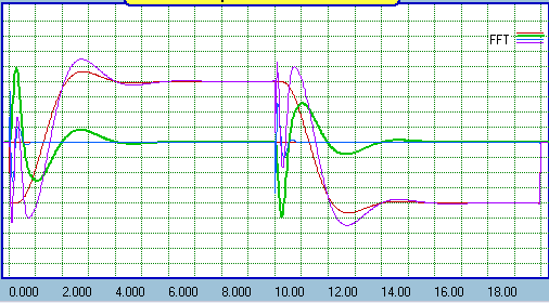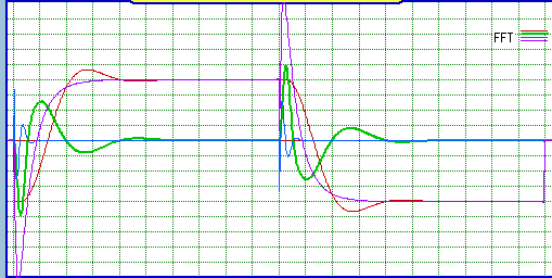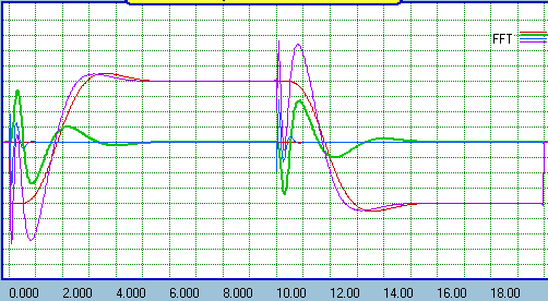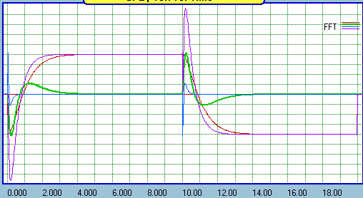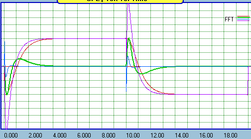 Below we see the step response for the case of γ = 1.1 on an expanded time scale. Again, Red = LP, green